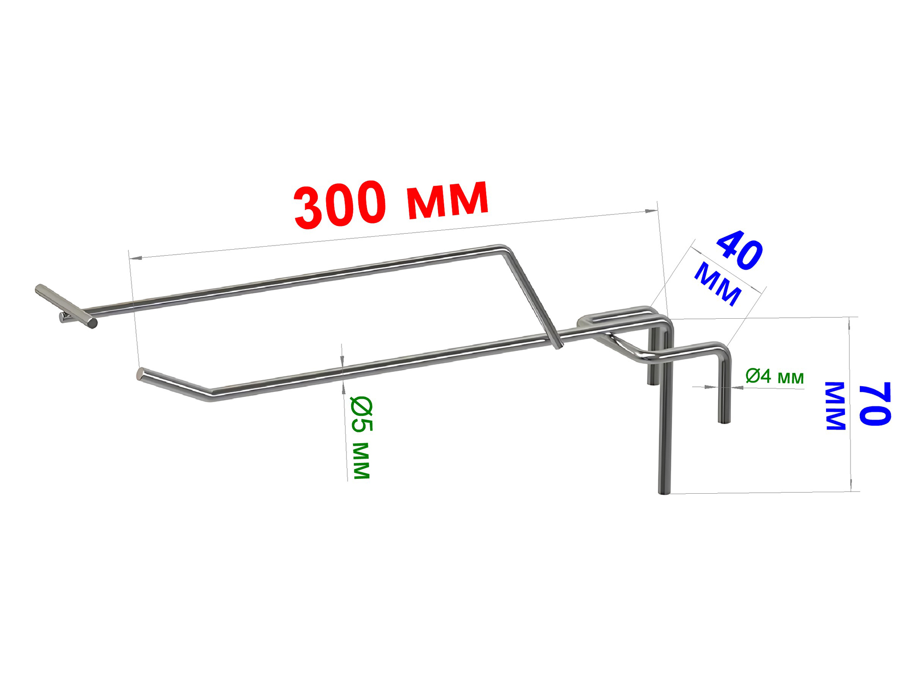 Длина 300 мм. Диаметр основного прутка 5 мм. Зацеп проволочный на сетку.