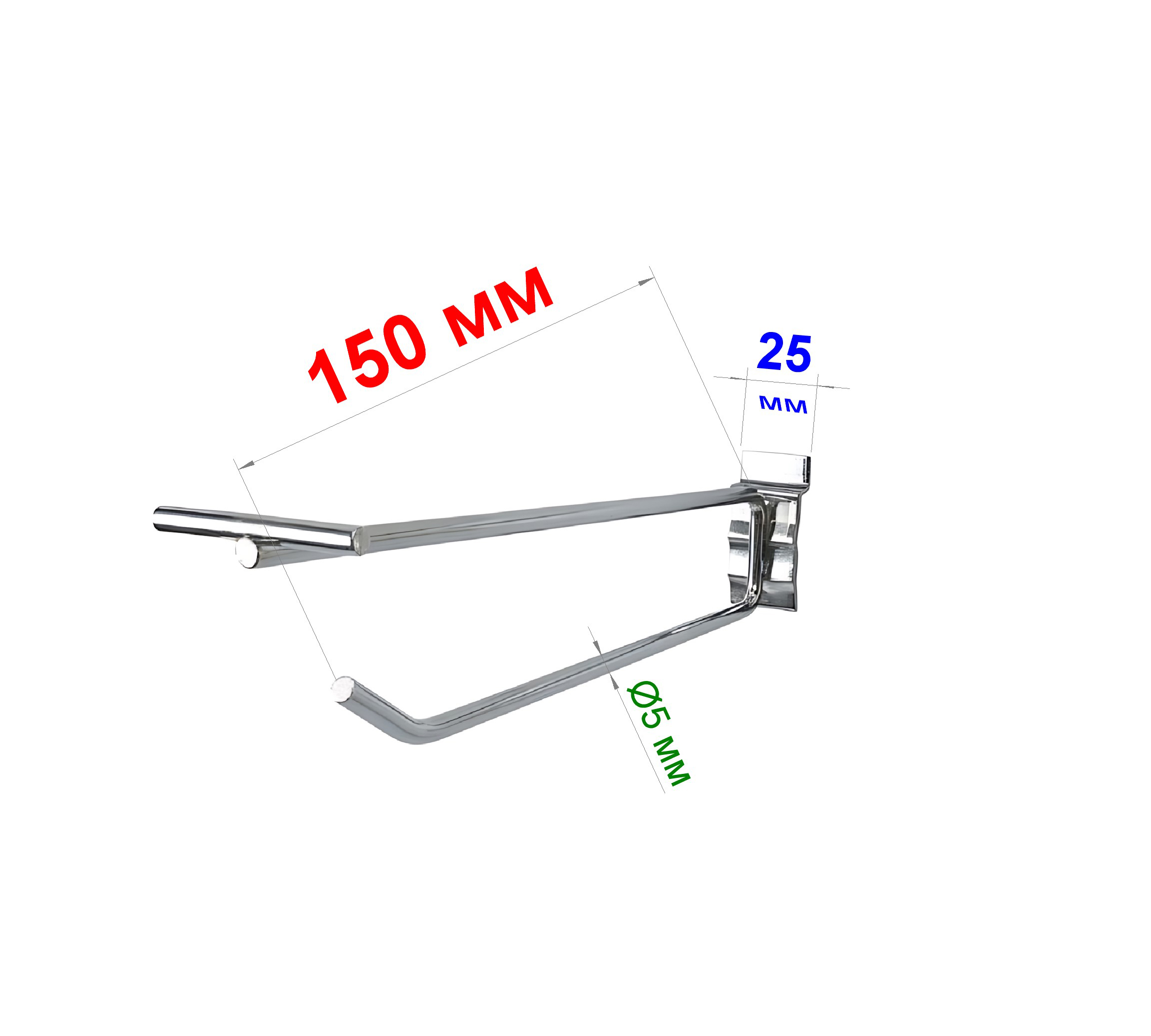 Длина 150 мм. Диаметр основного прутка 5 мм. Зацеп на экономпанель пластина ширина 25 мм.