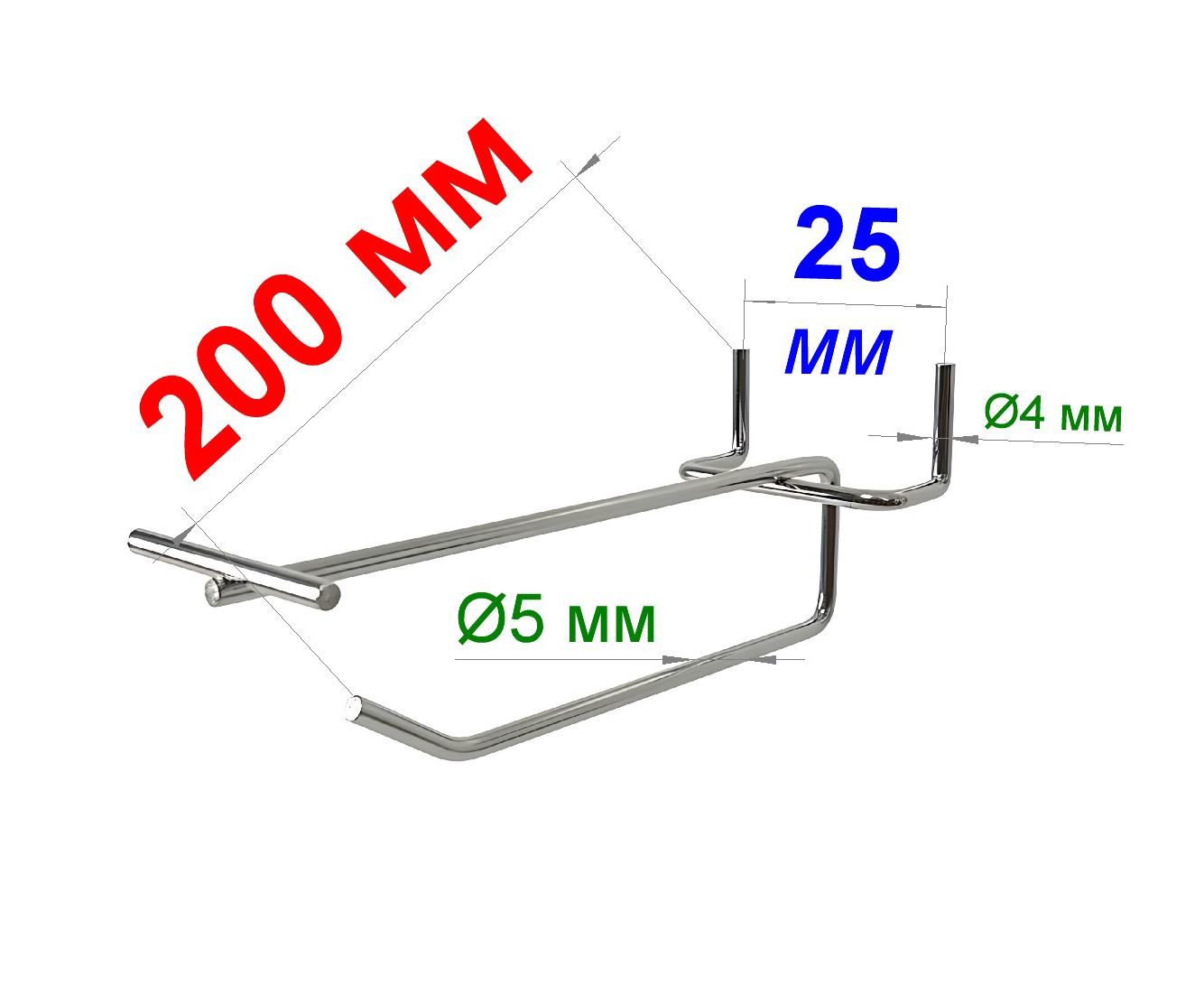 Длина 200 мм. Диаметр основного прутка 5 мм. Зацеп на перфорацию с шагом 25 мм.