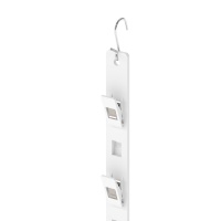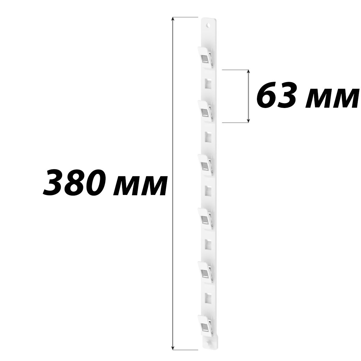 На ленте расположены шесть пластиковых крючков-фиксаторов с интервалом в 63 мм, обеспечивающих надежную и удобную поддержку товаров. В верхней части стрейп-ленты предусмотрено специальное отверстие для крепления к топперу или использования металлического крючка для подвешивания стрейп-ленты или хомута.