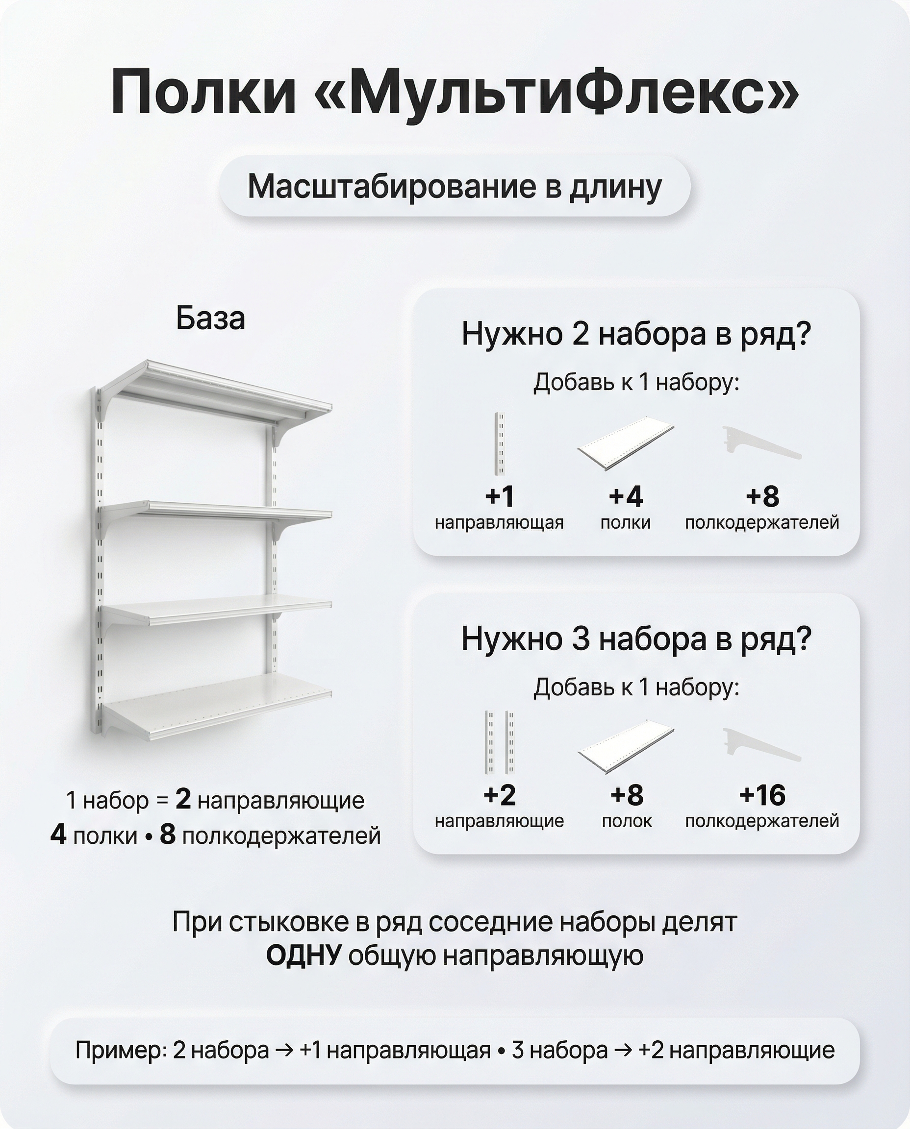 - Масштабируется : добавляйте направляющие и полки по высоте/ширине.