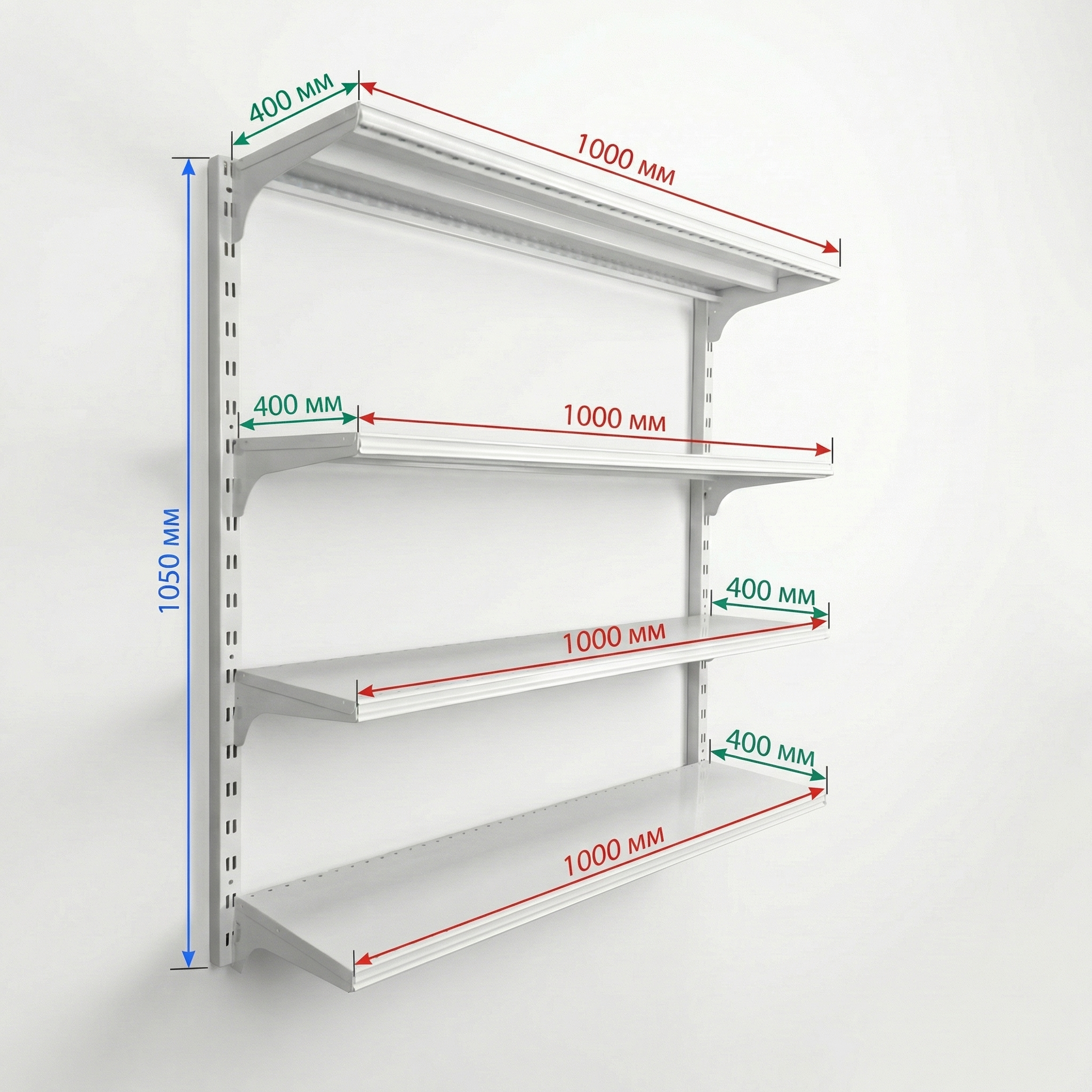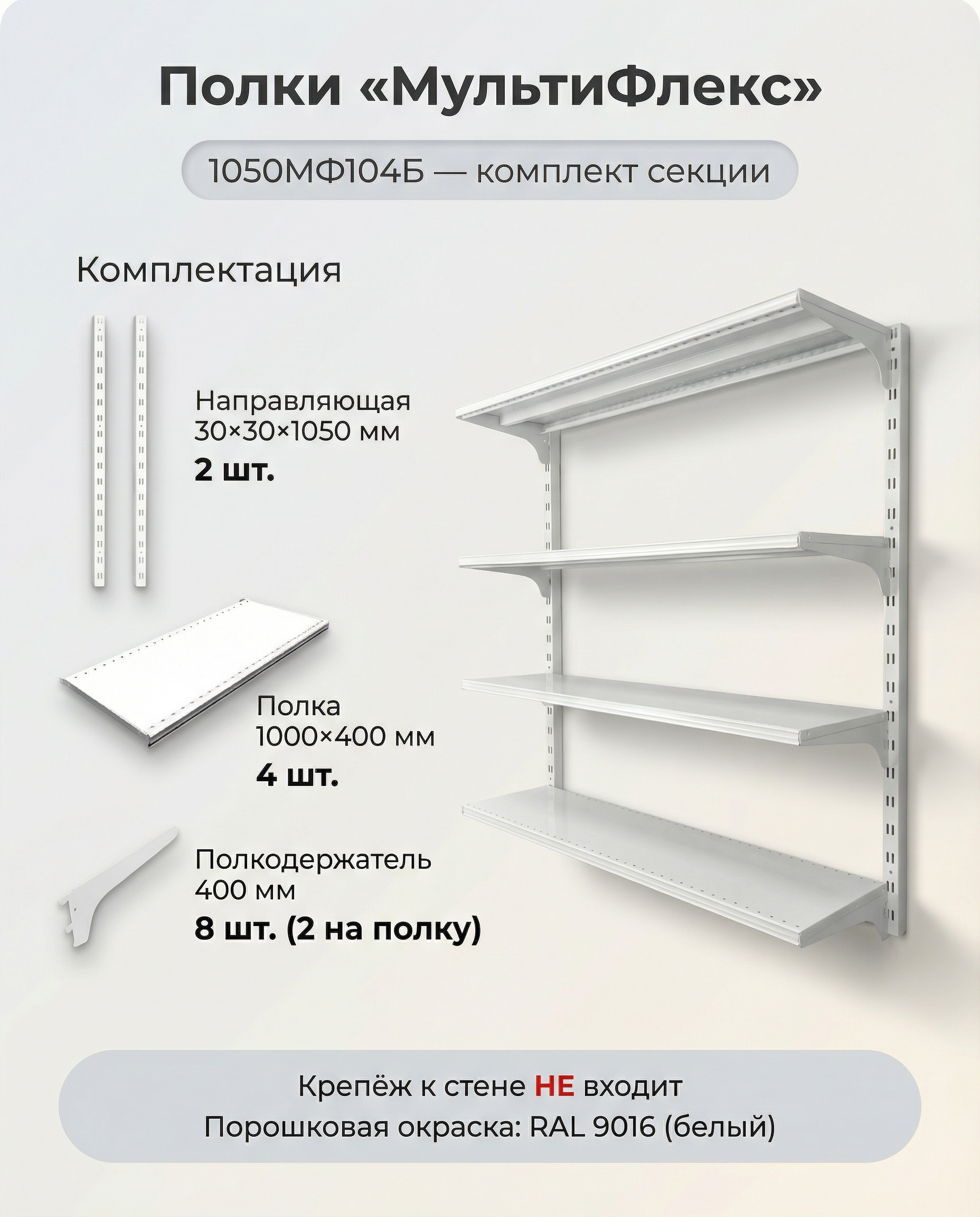 Система хранения на стену «МультиФлекс» — настенный стеллаж с полками 1000×400, 4 полки, до 70 кг/распределенной нагрузки, белый RAL 9016