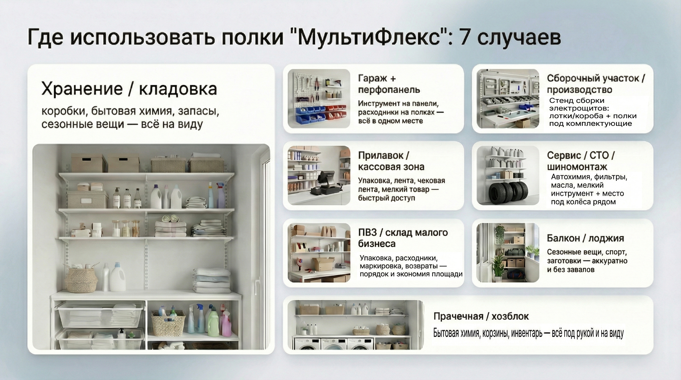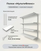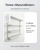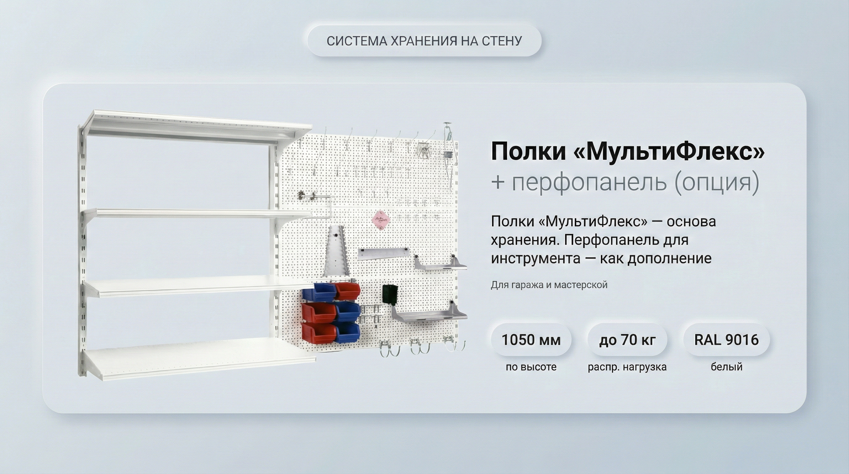 «МультиФлекс» — прочная система хранения на стене для кладовки, подсобки, гаража и мастерской. Полки перевешиваются по высоте с шагом 50 мм , выдерживают до 70 кг распределенной нагрузки и легко расширяются дополнительными секциями.