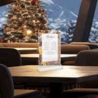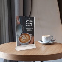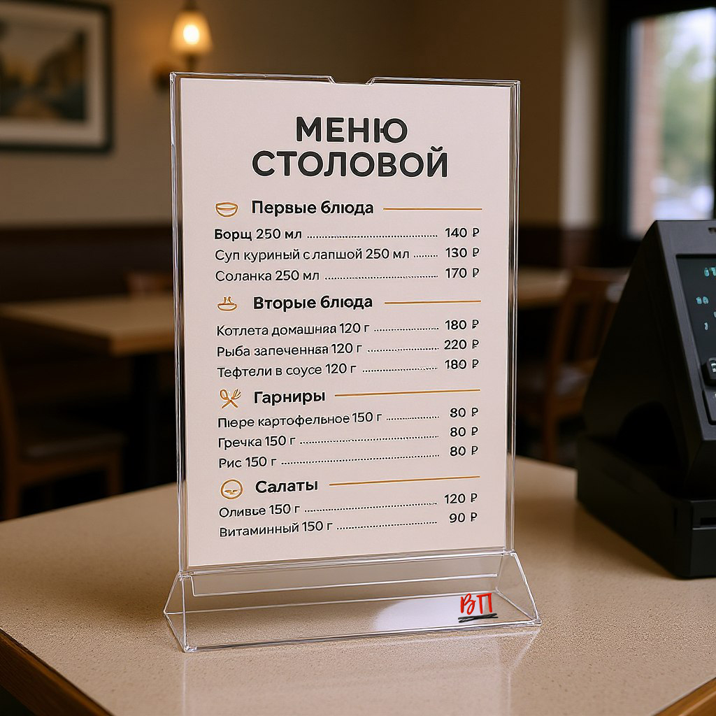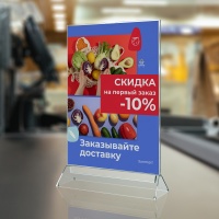 Описание: Компактная и устойчивая подставка для меню, ценников и информационных листовок формата A4. Двусторонний прозрачный карман с выемкой сверху вставляется в прорезь основания. Смена информации занимает секунды — без разборки и переворачивания. Обе стороны выглядят одинаково.