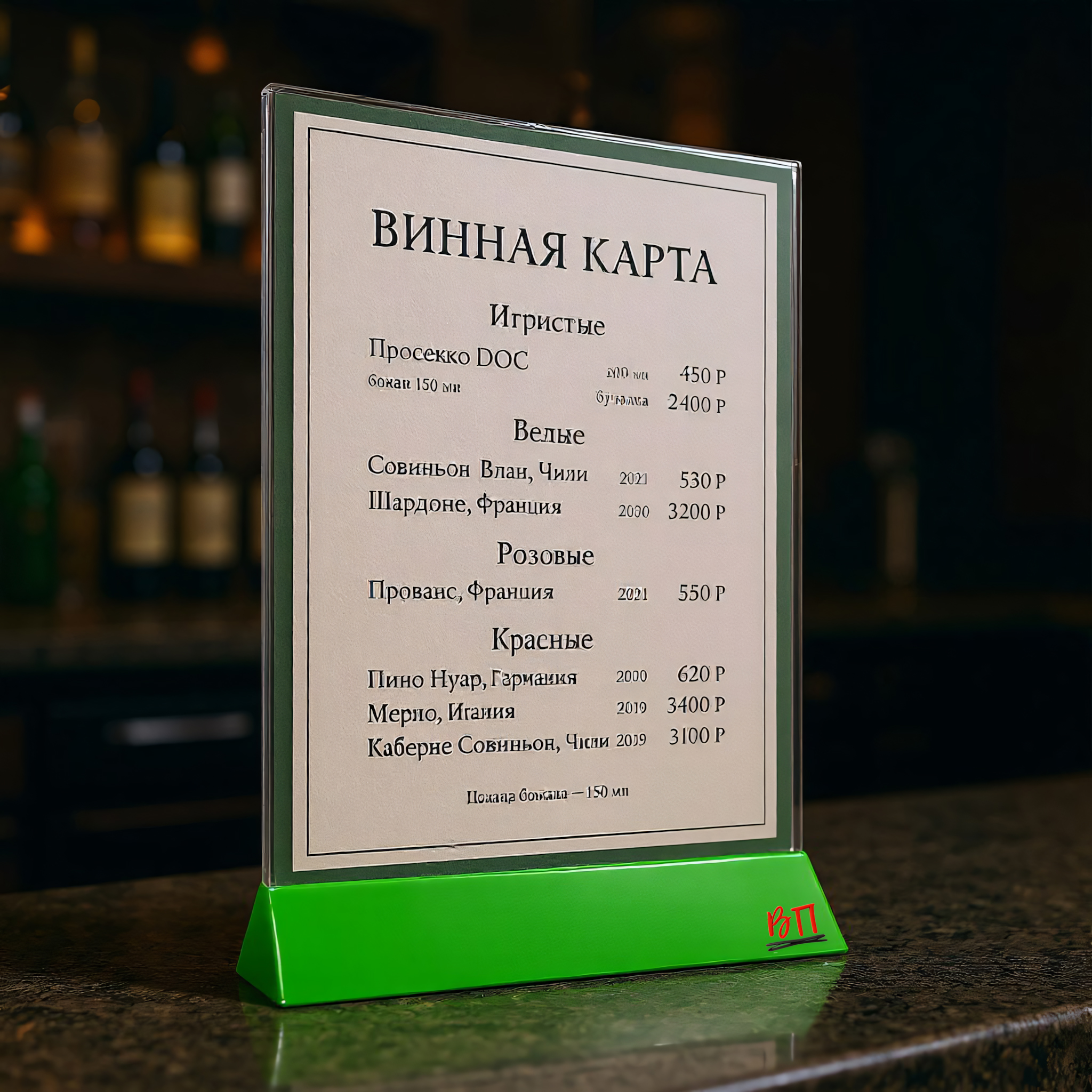 Аккуратная и устойчивая настольная подставка для меню, ценников и информационных листовок формата A4. Прозрачное рекламное поле выполнено в виде двустороннего кармана с выемкой сверху и вставляется в прорезь основания. Смена информации — за секунды, без разборки и переворачивания. Обе стороны выглядят одинаково.