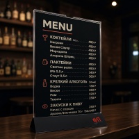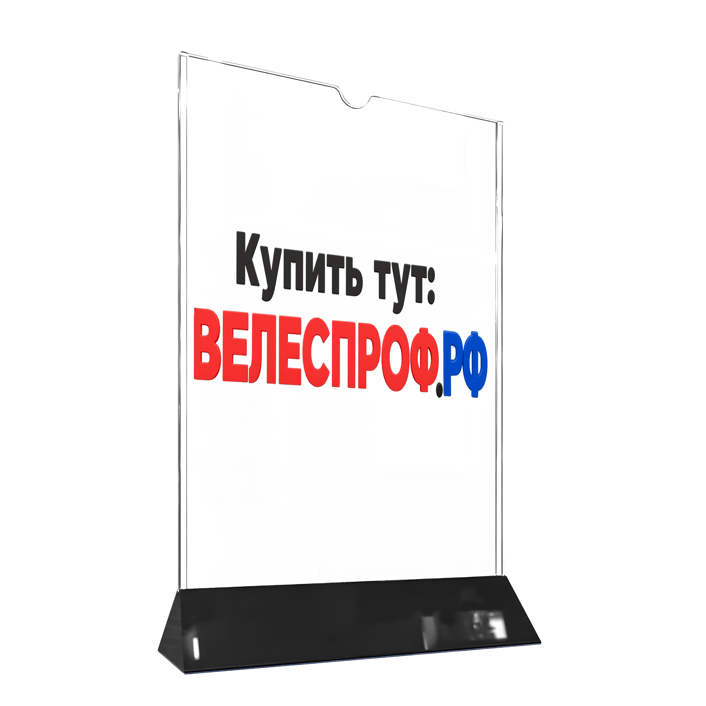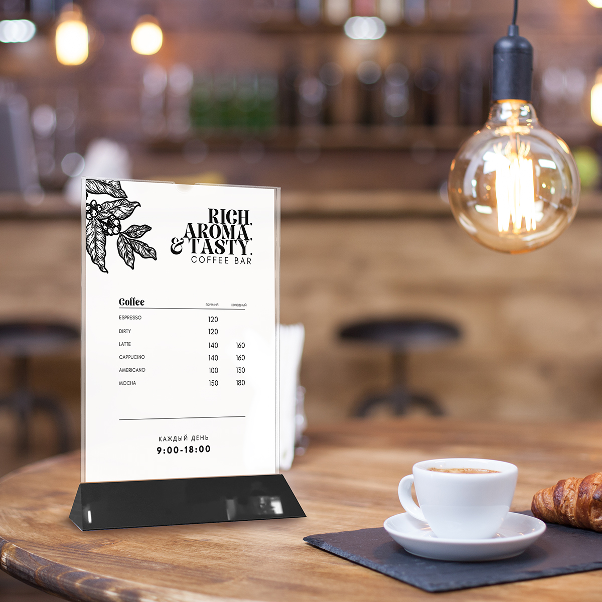 Аккуратная и устойчивая настольная подставка для меню, ценников и информационных листовок формата A4. Прозрачное рекламное поле выполнено в виде двустороннего кармана с выемкой сверху и вставляется в прорезь основания. Смена информации — за секунды, без разборки и переворачивания. Обе стороны выглядят одинаково.