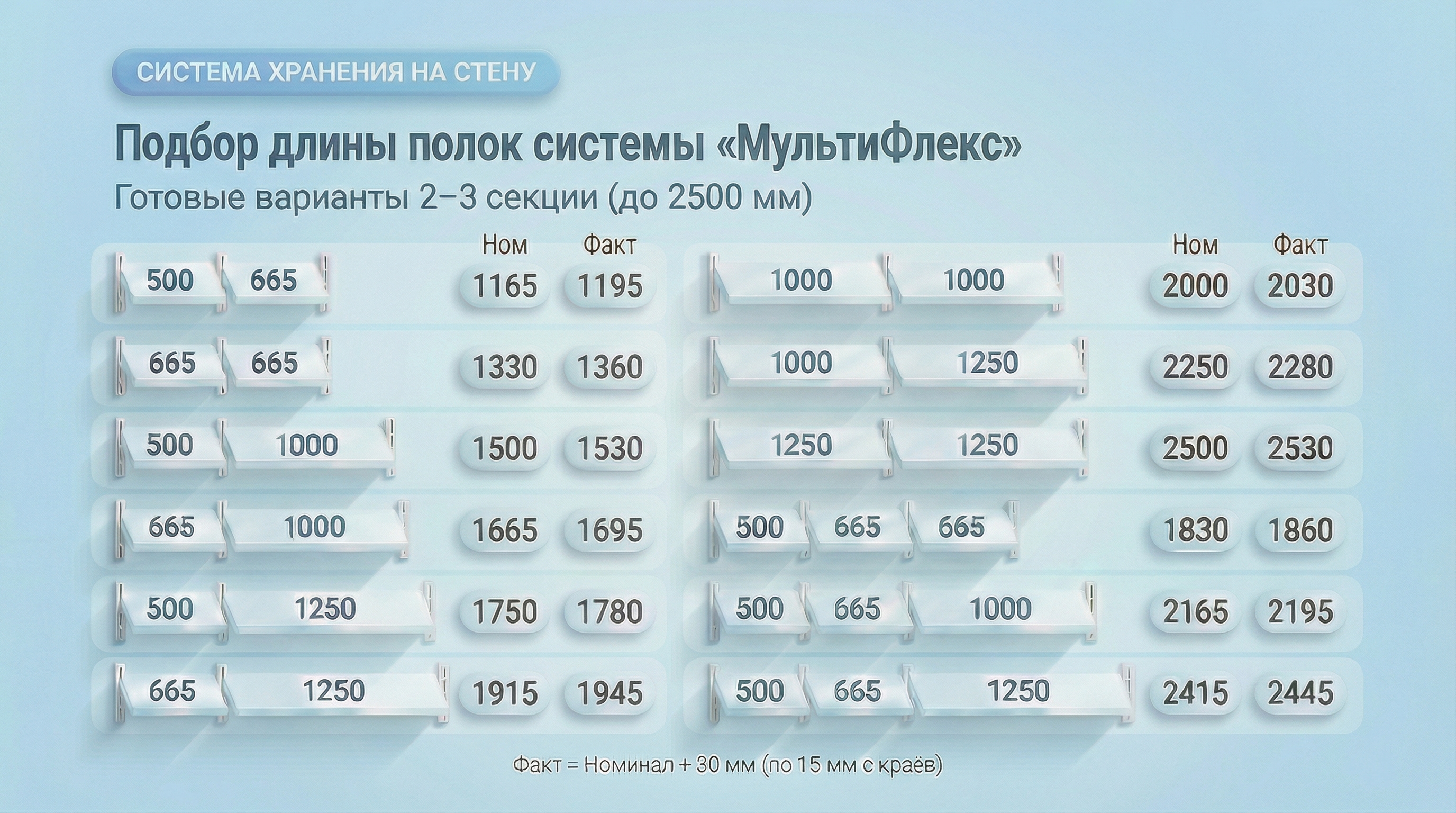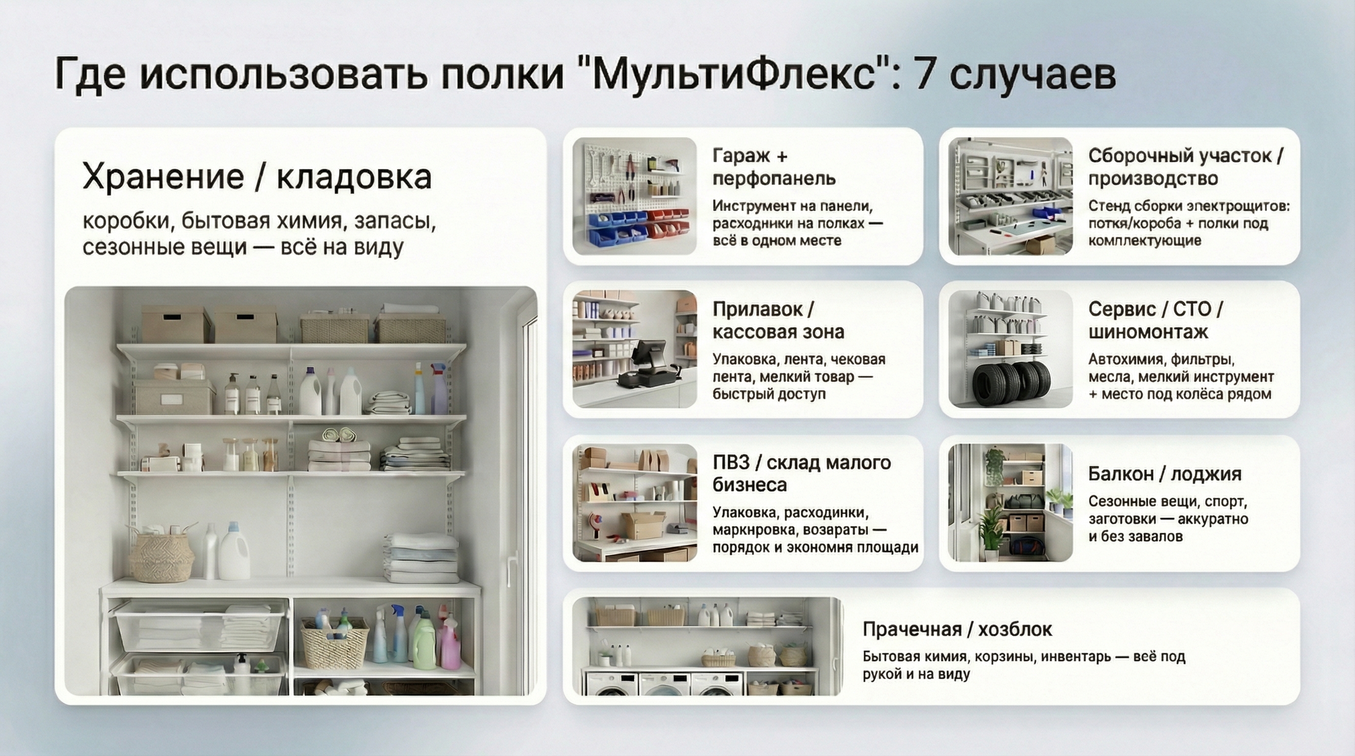«МультиФлекс» — прочная система хранения на стене для кладовки, подсобки, гаража и мастерской. Полки перевешиваются по высоте с шагом 50 мм , выдерживают до 70 кг распределенной нагрузки и легко расширяются дополнительными секциями.