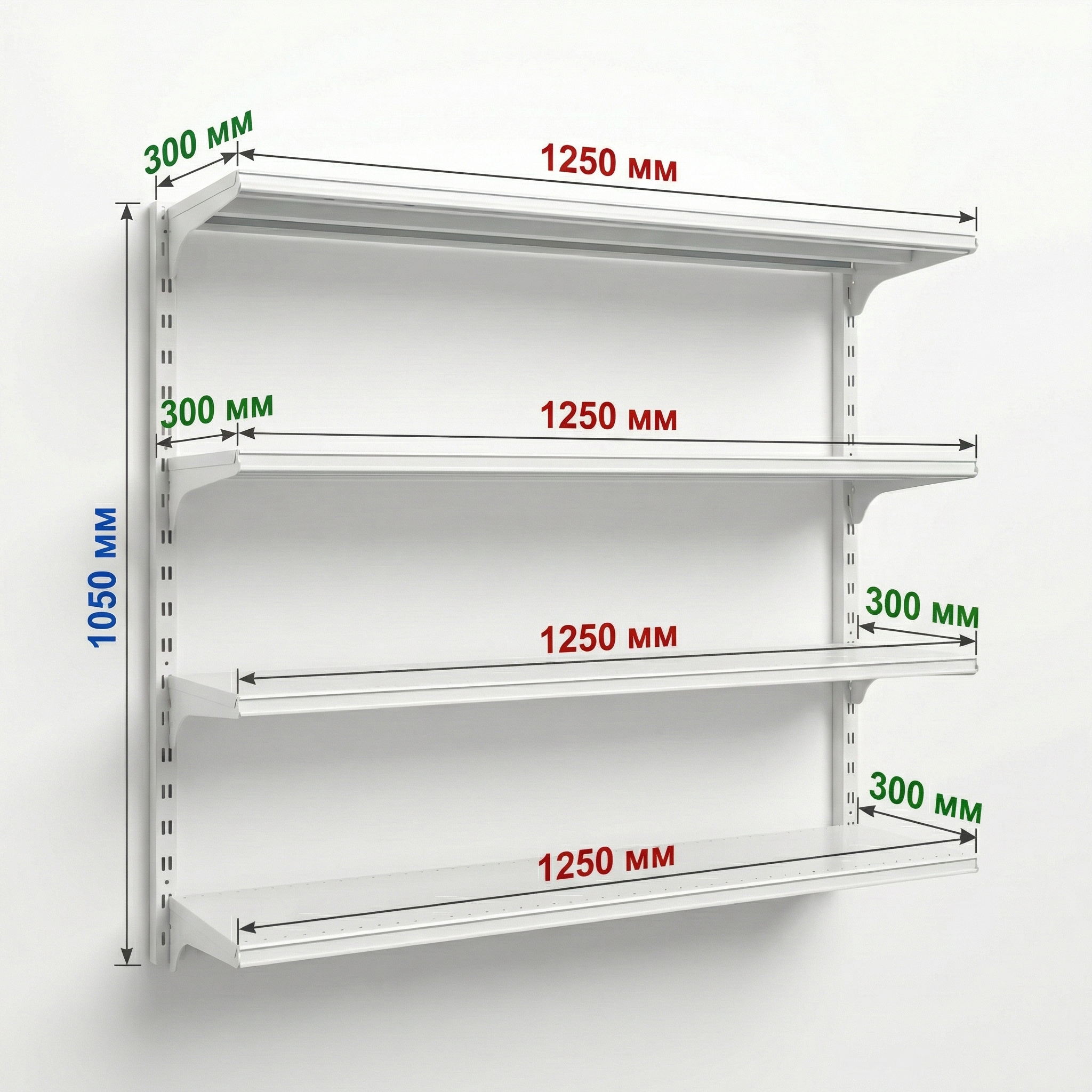 - Полка 300×1250 мм — 4 шт (длина 1250 мм , глубина 300 мм )