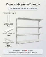 Система хранения на стену «МультиФлекс» — настенный стеллаж с полками 1250×300, 4 полки, до 70 кг/распределенной нагрузки, белый RAL 9016