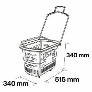 В ассортименте магазина «ВелесПроф» представлена пластиковая покупательская корзина тележка на колесах. Технические характеристики продукции: